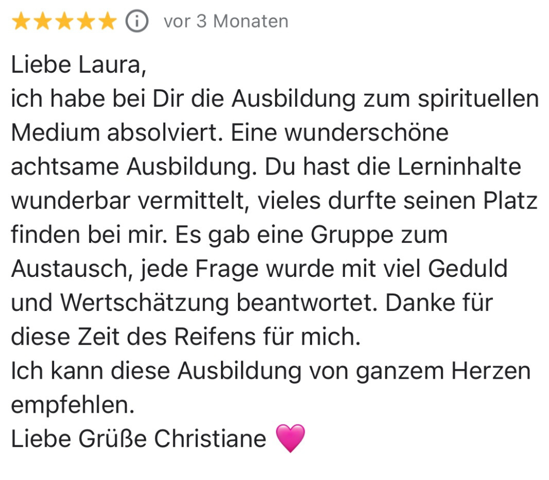 Das Mindestalter zur Teilnahme liegt bei 18 Jahren. Bitte beachte, dass die Ausbildung zum Medium keinen Ersatz für eine ärztliche oder psychotherapeutische Behandlung darstellt. Dir obliegt die Verantwortung darüber, deine physische und psychische Belastbarkeit diesbezüglich einzuschätzen und eine Teilnahme ggf. mit deinem Psychotherapeuten oder Arzt abzusprechen.